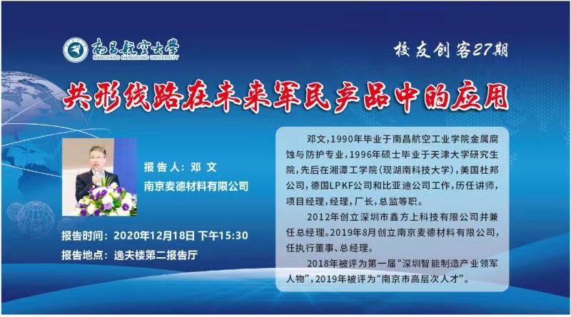 2020年12月18日 下午15:30,鄧文總經(jīng)理參加南昌航空大學(xué)校友創(chuàng)客講座,在逸夫樓第二報(bào)告廳為全校師生做報(bào)告《共形線路在未來軍民產(chǎn)品中的應(yīng)用》,鄧總結(jié)合自己的親身工作經(jīng)歷,為師生們深入淺出地講解了立體線路的特點(diǎn)及在工業(yè)制造,5G技術(shù)、智能汽車、軍事領(lǐng)域的應(yīng)用,希望同學(xué)們?cè)趯W(xué)習(xí)中擴(kuò)展知識(shí)面,勤學(xué)多思,在最好的時(shí)代綻放最美的自己。